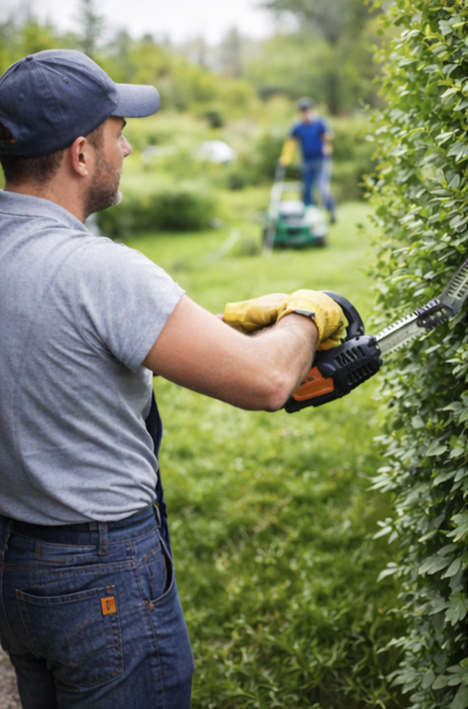 Rasen- und Heckenschnitt, Pflege von Grünanlagen, Laubentfernung und Bewässerung.